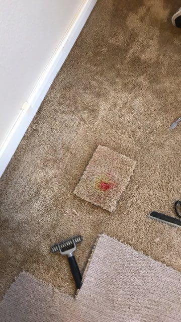 - Color Restoration – If your carpet has been discolored by a set-in stain or harsh chemical such as bleach, carpet color restoration can help you restore your carpet’s hue. Small spots treated with color restoration are very hard to detect, and the process is less expensive than replacing your entire carpet. Sometimes it may involve replacing a small section of the carpet with a new piece as seen in some of the color restoration pictures below.